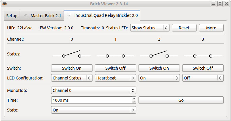 Wenn der Brick per USB an den PC angeschlossen wird sollte einen Moment später im Brick Viewer ein neuer Tab namens "Industrial Quad Relay Bricklet 2.0" auftauchen. Wähle diesen Tab aus. Anschließend sollte die LED über den Brick Viewer geschaltet werden können.