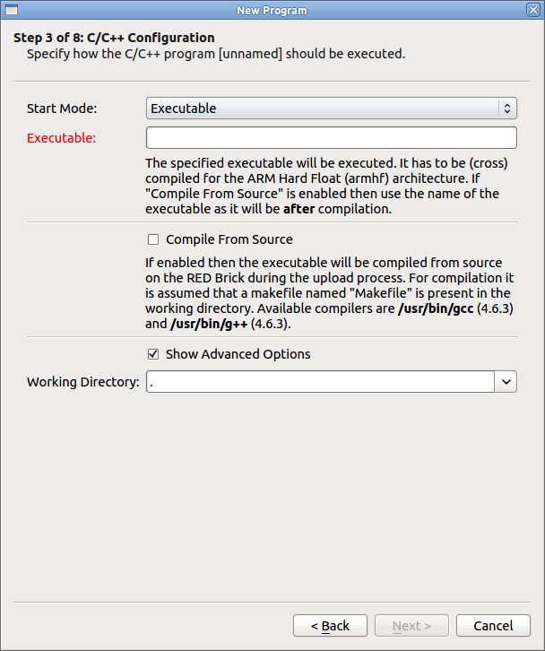 Executable: Der Name der ausführbaren Datei, die ausgeführt werden soll. Dies ist entweder der Name der cross-kompilierten ausführbaren Datei, die hochgeladen wurde, oder der Name der ausführbaren Datei die während des Kompilieren erstellt wird.
