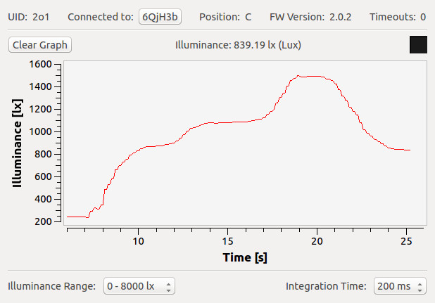 A good test for the sensor is to darken the room and slowly move a flashlight over the sensor, the graph should then look approximately as in the screenshot shown below.