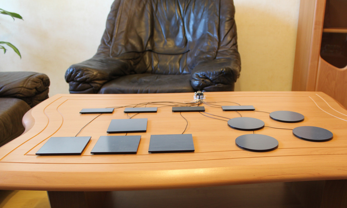The Giant Game Pad consists of different pads made out of 3mm PMMA. Besides the pads there is 10m of stranded wire, two 1m pieces of aluminum tape and a 12 pole IDC connector included in the kit.