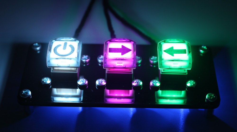 Below you can find an example of three RGB LED Button Bricklets with different inlays with and without ambient light. The symbol inlays were printed by a laser printer on transparent foil.
