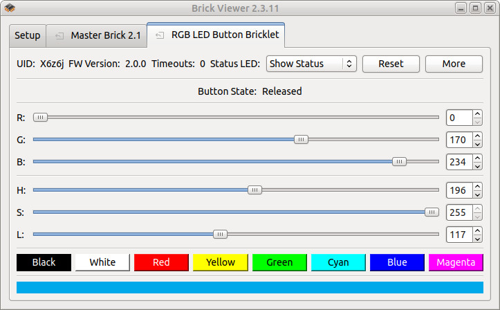 To test a RGB LED Button Bricklet you need to have Brick Daemon and Brick Viewer installed. Brick Daemon acts as a proxy between the USB interface of the Bricks and the API bindings. Brick Viewer connects to Brick Daemon. It helps to figure out basic information about the connected Bricks and Bricklets and allows to test them.