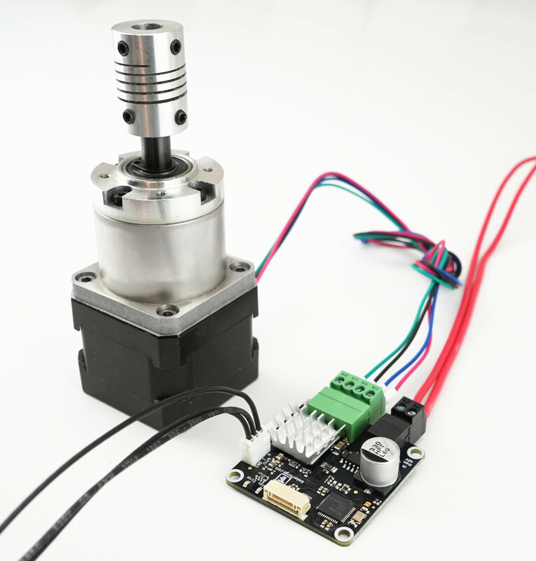 The stepper motor is powered by an external power supply connected directly to the Bricklet (black connector).