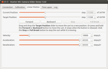 The "Forward" and "Backward" buttons work just as the ones on the "Calibration" tab. But this time the cart moves with the configured velocity, acceleration and deceleration.